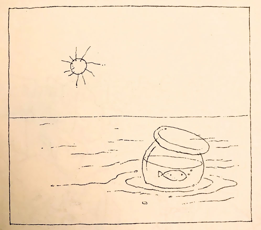 تصور من از کشیدن آن طرح صرفاً این بود که بگویم ما همچون یک ماهی در تنگ کوچک شیشهای در دل دریا اسیریم. اما سید مرتضی آوینی وقتی برای بار اول طرح را دید، پیشانیام را بوسید و گفت: «میبینی سید جان چقدر تنهاییم، کمی تلاش کنیم با یک جست میتوانیم خود را به اقیانوس عشق برسانیم. عشق را میبینیم، فاصلهمان با آن تنها یک جداره نازک شیشهای است اما...»