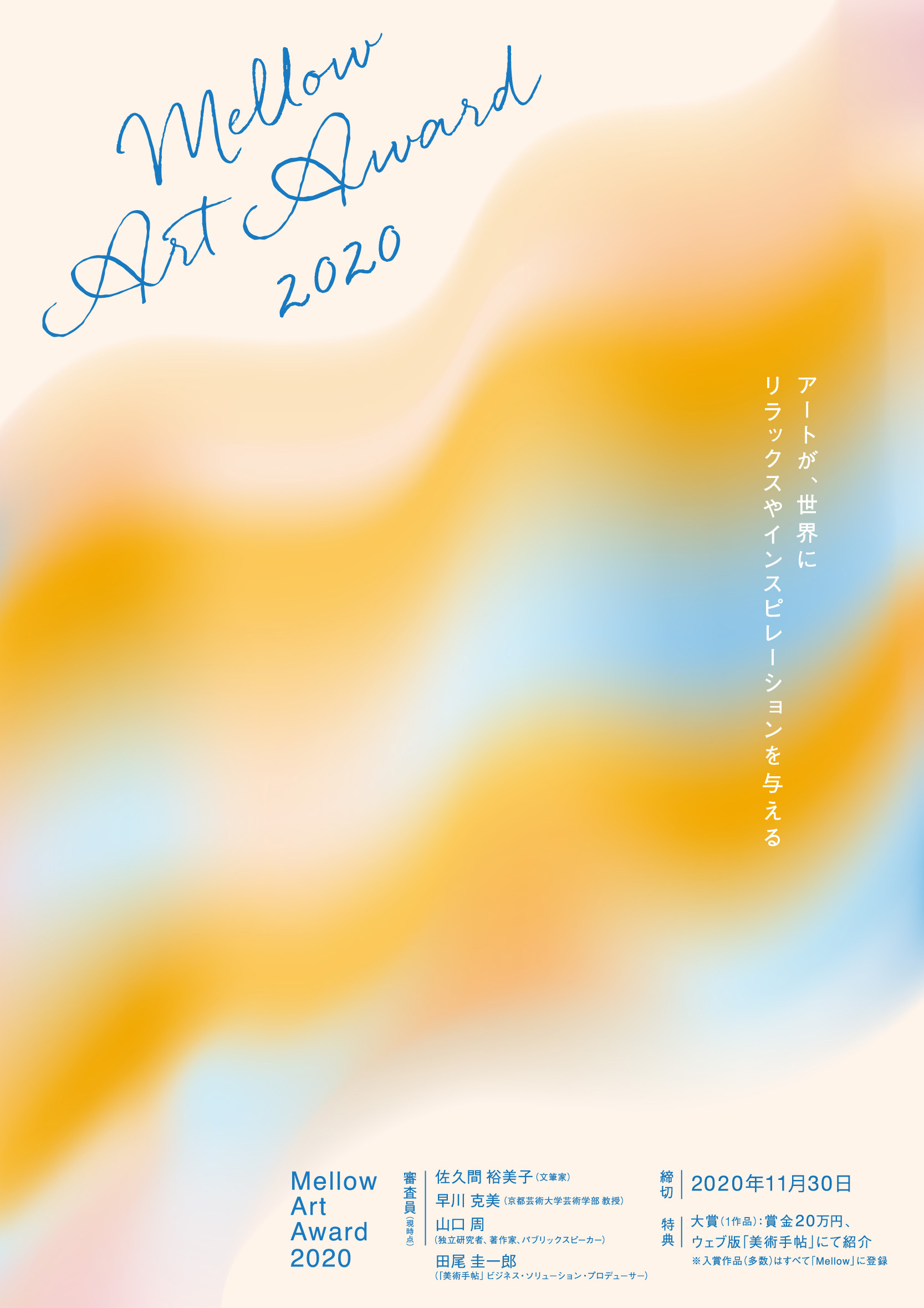 به گزارش روابط عمومی مرکز تجسمی حوزه هنری به نقل از award.mellow.love، جایزه هنری Mellow 2020 که توسط ملو و با مشارکت Bijutsutecho (مشهورترین مجله هنری در ژاپن) سازماندهی شده است، به دنبال آثار هنری است که از طریق اپلیکیشن "Mellow" در سراسر جهان توزیع شود.