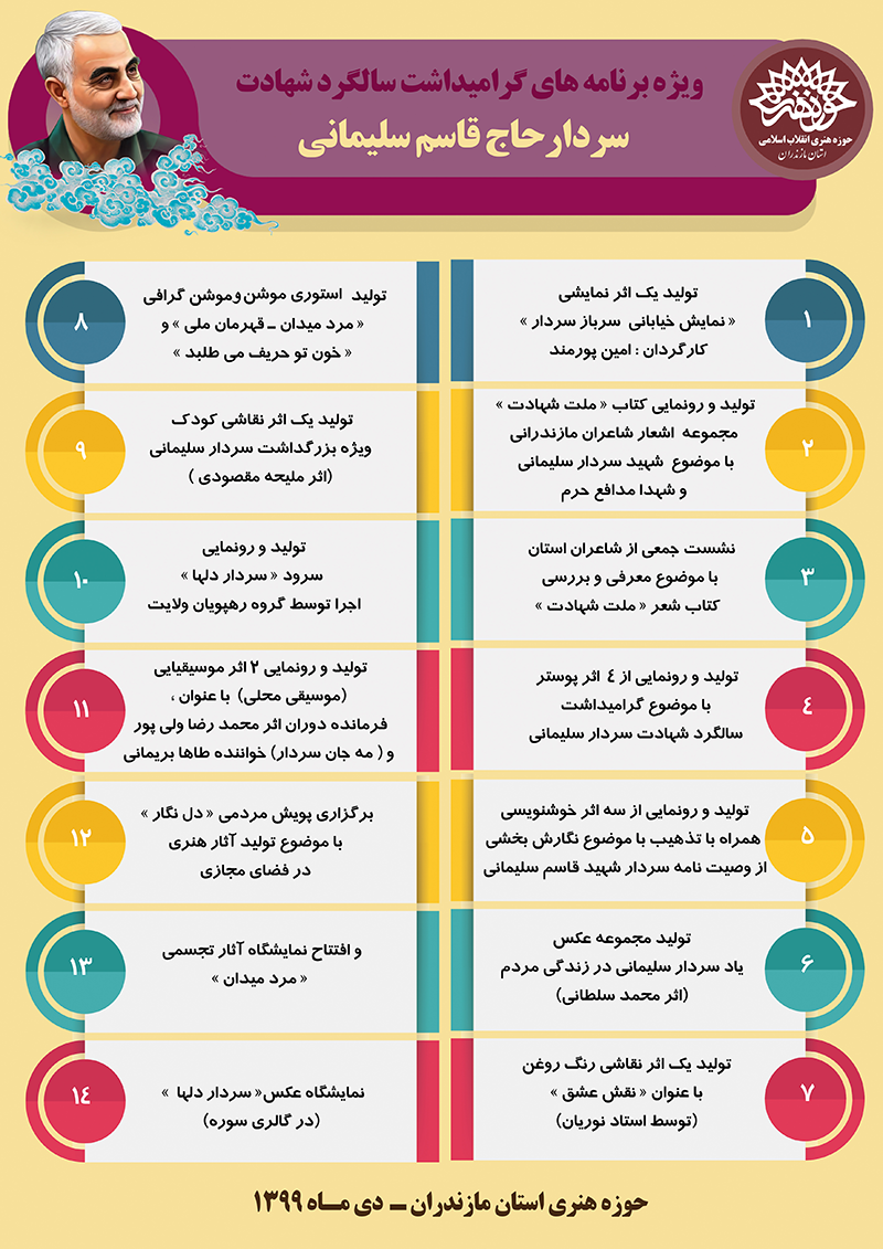 شایان ذکر است که جدول برنامه ها و تولیدات حوزه هنری مازندران در نخستین سالگرد شهادت سردار سلیمانی بدین شرح می باشد: