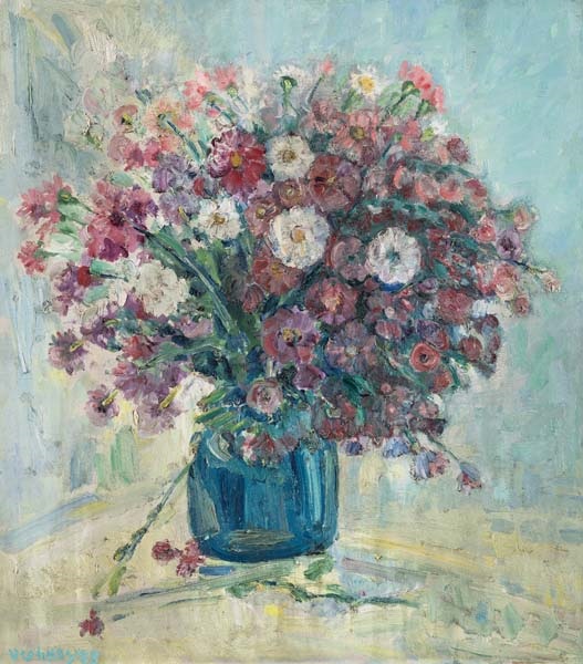 گرچه امروزه شناختهشدهترین آثار مهدی ویشکایی پرترههایی هستند که از شخصیتهای ایرانی و خارجی خلق کرده، اما او در ساخت طبیعتبیجان بهویژه گلها هنرمندی برجسته و شاخص در زمان خود محسوب میشود. او در رنگگذاری، به بیانی شخصی و قلمی منحصر به خود رسیده است. به همین جهت در طبیعتبیجانهایش نیز همچون اغلب پرترههایی که ساخته، نشان مشخصی از ضربهقلمهای بیپروا و هیجانی دیده میشود. قلم پرشتاب او به بهترین شکل، تصویرپردازی مدرن ایرانی را در آغاز آن نشان میدهد و همچنین رنگهای غلیظ و ضربهقلمهای سریع، اغواکننده و پراکنده او، نوعی کشش نیرومند تصویری را به بیننده منتقل میکند. همانطور که در این اثر نیز به خوبی دیده میشود، در آثار ویشکایی کمتر پرداخت جزییات و چینش منظم رنگها دیده میشود. در واقع آمیختگی این ویژگیها، هارمونی شگفتانگیز سطوح رنگی در ترکیببندیهای آشنای او را میسازد.
