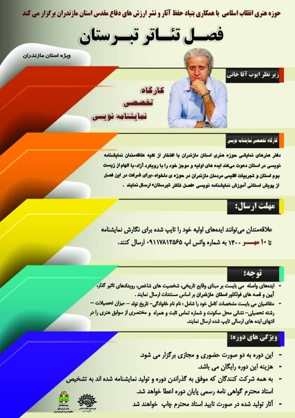 به گزارش روابط عمومی حوزه هنری مازندران فراخوان کارگاه تخصصی نمایشنامه نویسی « فصل تئاتر تبرستان » با حضور « ایوب آقاخانی » منتشر شد.