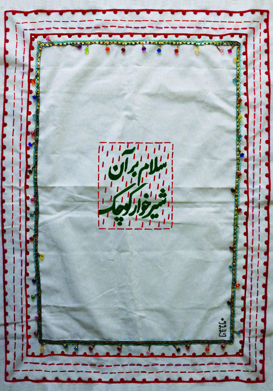او که با اثر «سلام بر آن شیرخوار کوچک» در دهمین سوگواره هنر عاشورایی شرکت کردهبود در خصوص این اثر گفت: موضوع این اثر حضرت علی اصغر(ع) بود. این اثر از دو بخش تشکیل شده بود که در وسط این اثر، جمله «سلام بر آن شیرخوار کوچک» کار شده بود و در اطراف آن حاشیه دوزیهایی برگرفته از پرچمهای قدیم دیده میشد.