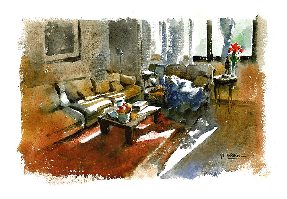 «از دورانی که در هـنرستان اصفهان مشغول به تحصیل هنر بودم به آبرنگ علاقهمند شدم و از همان سالها به آموختن این شیوه از نقاشی پرداختم،دیدن آثار استادانی چون یرواند و سمبات در این راه برایم بسیار سودمند بود.در مورد آبرنگ باید گفت که تکنیک آبرنگ در نقاشی از مشکلترین تـکنیکهاست.در ایـن روش هر قدر تعداد قلم(تاش)روی اثر کمتر باشد،کیفیت آن بهتر خواهد بود.در آبرنگ،نقاش نمیتواند چیزی را در حین نقاشی عوض و یا از بین ببرد، پس یک تصمیم و تفکر اولیه بـاید کـاملا منطقی و حساب شده باشد.البته منظورم از منطقی و حساب شده رد احساس در این شیوه نیست،بلکه تمام این موارد که اصولا فنون کار به شمار میروند در استحالهای از احساس هنرمند شکل میگیرند و سپس روی صفحه نقش میبندند».