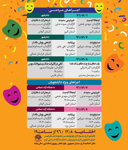 وی افزود: در مرحله نهایی ششمین جشنواره سراسری تئاتر تک طنز «تکخند»، اجراهای عمومی و داوری آثار از روز یکشنبه 6 اسفند ماه در شهر کرج آغاز و برگزیدگان روز 8 اسفند ماه در مراسم اختتامیه تقدیر میشوند.