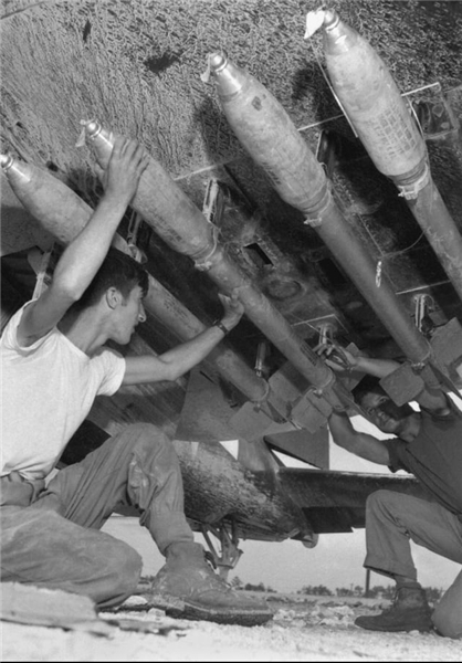 این عکس را دانکن در طی جنگ جهانی دوم گرفته که در تصویر دو سرباز در حال نصب ۵ راکت ۵ اینچی بر روی جنگنده کورسِیر در طی نبرد اوکیناوای ژاپن هستند.