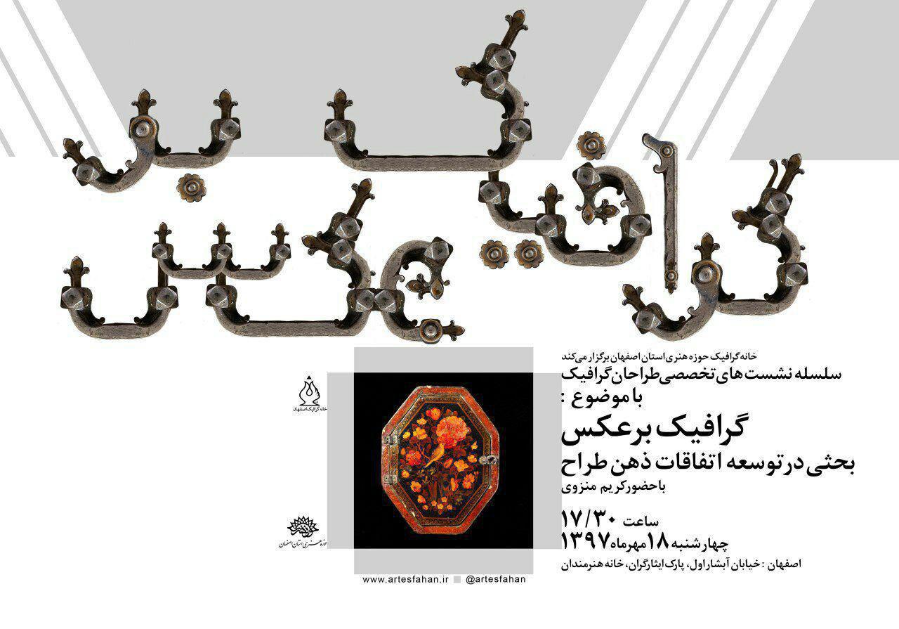 به گزارش روابط عمومی حوزه هنری استان اصفهان، در این نشست که با حضوراستاد کریم منزوی ( گرافیست و عکاس) در ساعت۱۷:۳۰روز چهارشنبه ۱۸مهر در خانه هنرمندان برگزار می شود، استاد منزوی به بیان ارتباط میان گرافیک و عکاسی و خلاقیت های مشترک میان این دو هنر می پردازد.