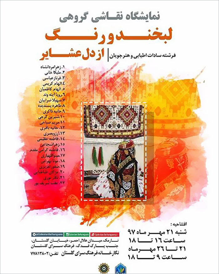 نمایشگاه گروهی نقاشی «لبخند و رنگ از دل عشایر» که از روز شنبه 21 مهرماه افتتاح شده تا تاریخ 26 مهرماه دایر است و علاقهمندان میتوانند همه روزه از ساعت 9 تا 18 از این آثار در فرهنگسرای گلستان واقع در نارمک، میدان هلال احمر، خیابان گلستان، ضلع شمالی بوستان فدک دیدن کنند و یا برای کسب اطلاعات بیشتر با تلفن 77813802 تماس بگیرند.
