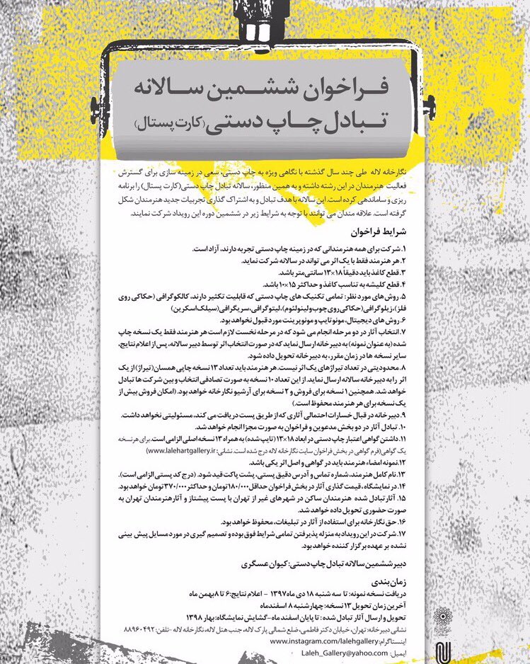 11- داشتن گواهی اعتبار چاپ دستی در ابعاد 18×13 به همراه 13 نسخه اصلی الزامی است. (برای هرنسخه یک گواهی -فرم گواهی در بخش فراخوان سایت نگارخانه لاله درج شده است. نشانی: www.lalehartgallery.ir)