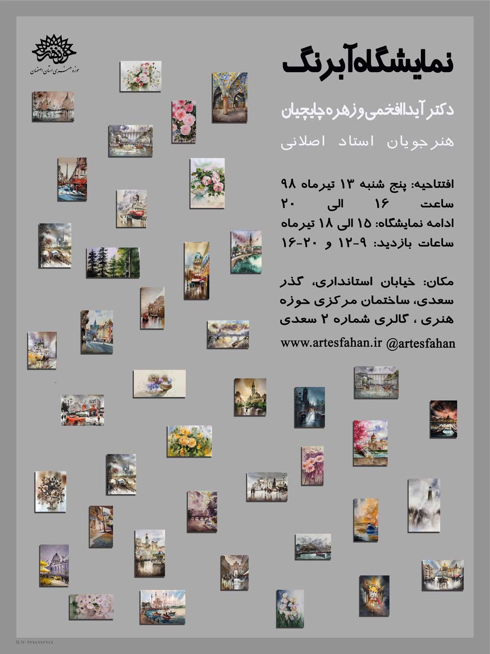آیدا افخمی متولد 62 اصفهان و فارغ التحصیل رشته دندانپزشکی است وی از سال 92 هنر آبرنگ را زیر نظر استاد اصلانی آموخت و سبک نقاشی این هنرمند رئال تجریدی با تکنیک آبرنگ است، آثار این هنرمند علاوه بر نمایشگاه های گروهی در کتاب شهر هشتم و باغ ایرانی به چاپ رسیده و موفق به کسب مقام سوم در فراخوان نگاه نو در سال 96 شده است.