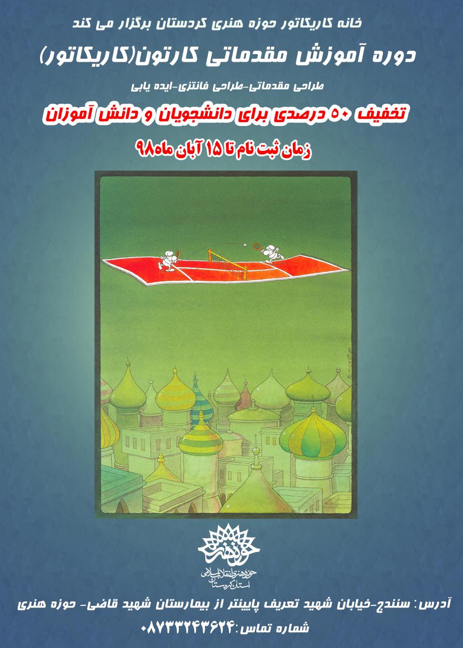 صولی به برگزاری چندین دوره ورک شاپ با حضور هنرمندان مطرح استان وکشور اشاره نمود وافزود: به منظورشناسایی ، جذب و پرورش استعدادهای هنری در بخش کارتون و کاریکاتور خصوصاً در بین دانش آموزان و دانشجویان علاقه مند استان ، دوره آموزش مقدماتی کارتون (کاریکاتور) از نیمه دوم آبان ماه ۹۸ با حضور هنرمندان مطرح استان آغاز می گردد .