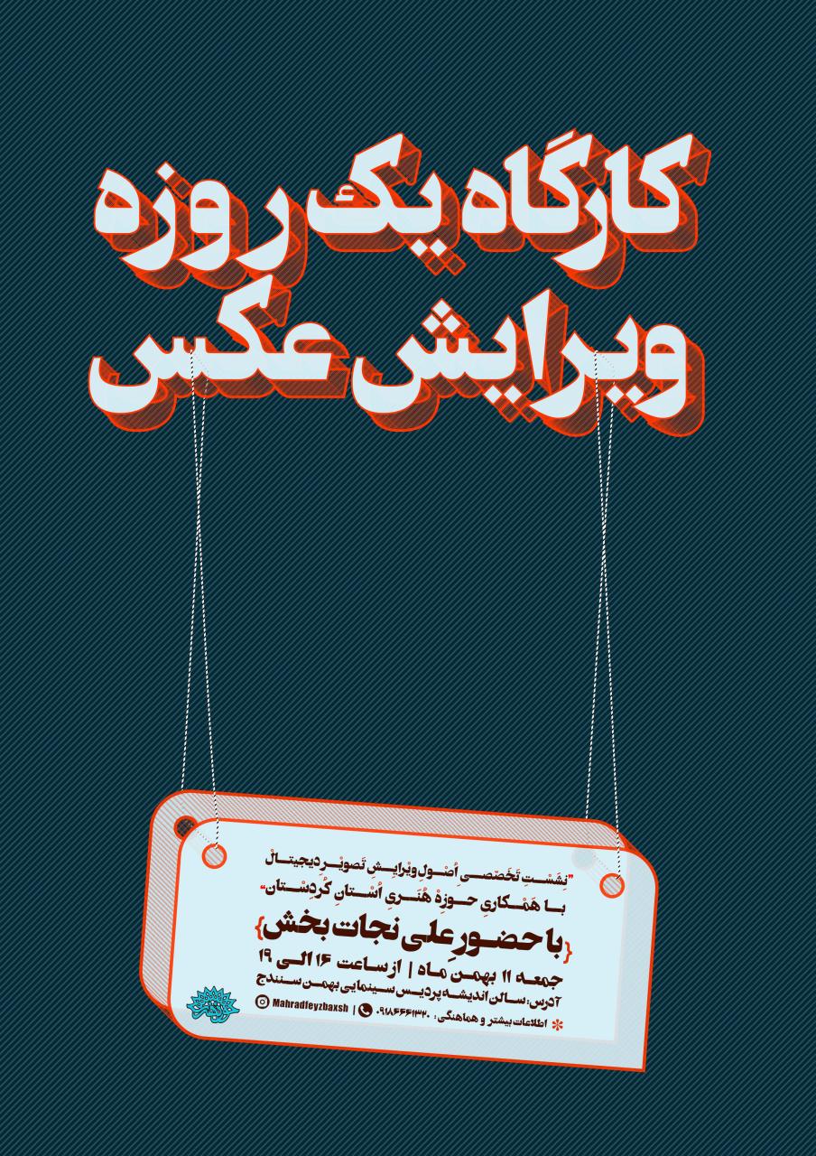 به گزارش روابط عمومی حوزه هنری انقلاب اسلامی استان کردستان، شیلان برهانی مسئول واحد آموزش وپژوهش حوزه هنری استان کردستان ضمن اعلام این خبرگفت: در ادامه برنامه های آموزشی و به منظور بالابردن سطح توان و دانش هنرمندان استان کارگاه یک روزه ویرایش عکس با حضور استاد علی نجات بخش از اساتید نام آشنای حوزه عکاسی در سنندج ویژه عکاسان وعلاقه مندان برگزار می شود.